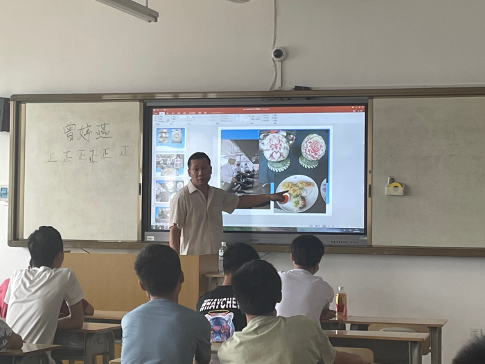 中式烹飪專業(yè)中級(jí)工班的梁仕棟教師從本專業(yè)課程設(shè)置、以賽促學(xué)模式、技能培養(yǎng)與證書(shū)等幾個(gè)方面作出講解,引導(dǎo)新生制定學(xué)習(xí)目標(biāo),并希望新生們?cè)谌陼r(shí)間里積極參賽,習(xí)得一技之長(zhǎng),變成璀璨之星。羅惠光教師則通過(guò)優(yōu)美的圖片向新生們展示了優(yōu)秀雕花作品。